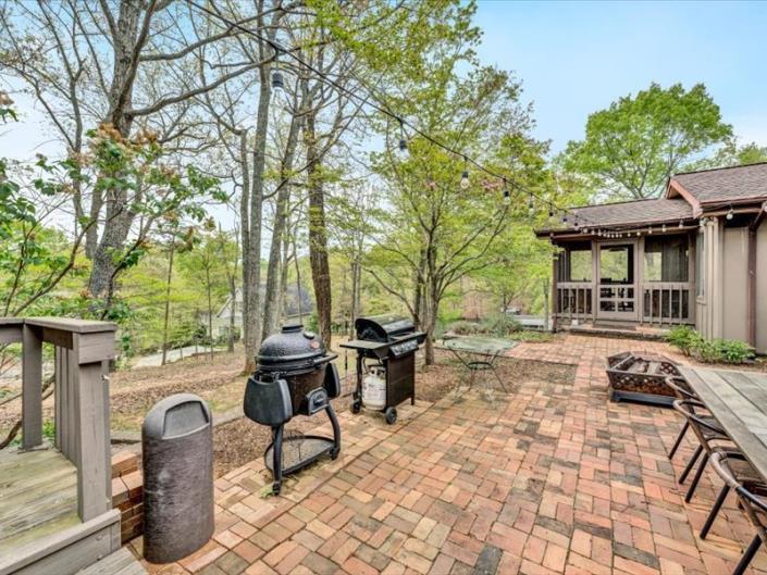Brick patio area off of the side of the house w/string lights & ample furniture for outdoor meals. Gas grill available.