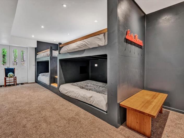 Lower level has 2 bedrooms, 2 flex rooms & 2 bathrooms. 1 flex room has 2 sets of custom bunks (4 queen beds).